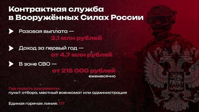 Что тебя ждет? Высокая зарплата (от 215 тысяч рублей в месяц в зоне СВО), статус ветерана боевых действий, кредитные и налоговые каникулы, десятки льгот для тебя и семьи.